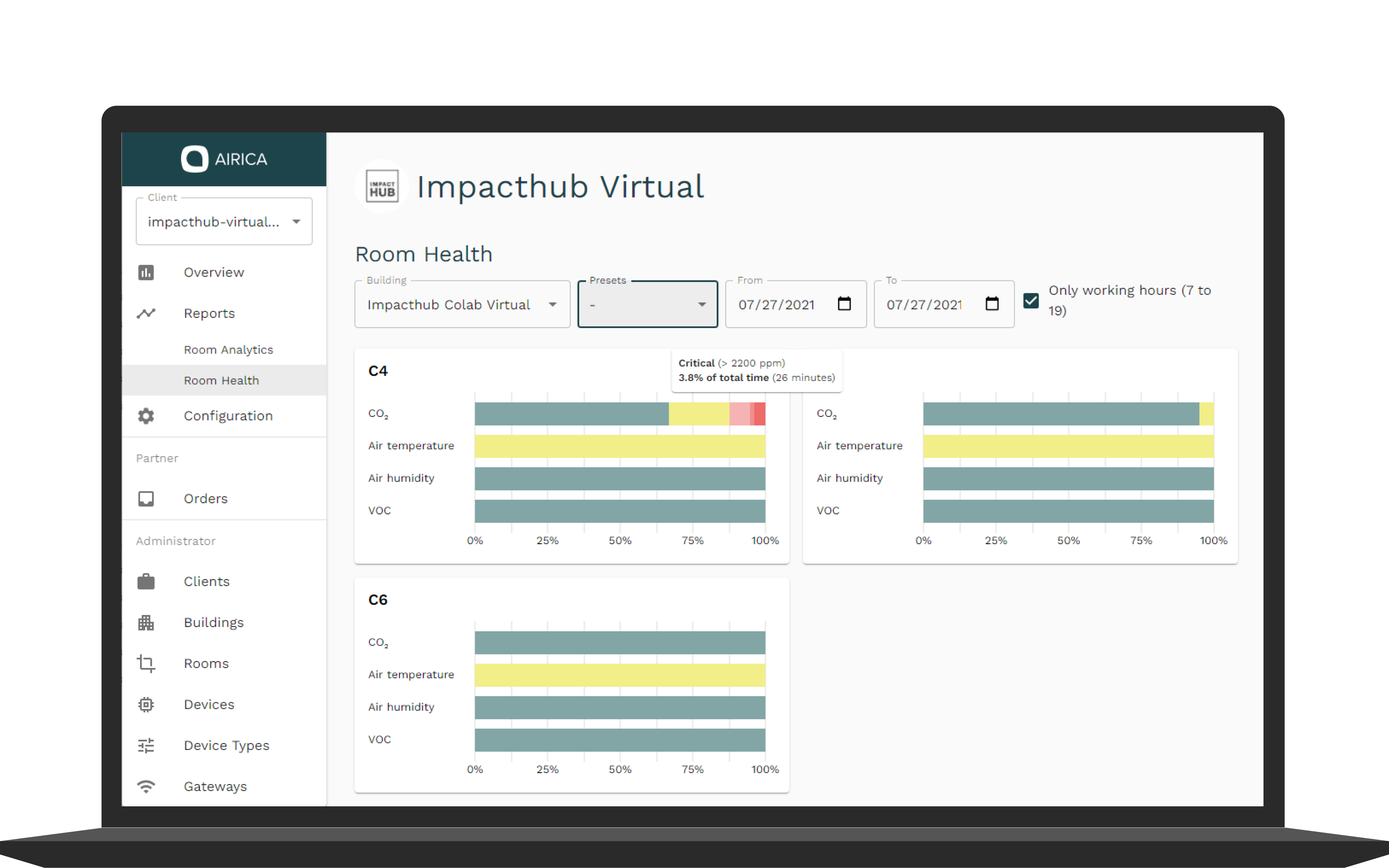 Mit unserer Raumluftüberwachungs- und Analytics Lösung erhalten Sie datenbasierte Insight über die Luftqualität ihrer Kunden. Sie und er erhalten Transparenz über vorhandene Lüftungs- und Klimaanlagen. Sie können ihm damit die richtigen organisatorischen und baulichen Massnahmen vorschlagen, um die Luftqualität zu verbessern. Damit sind sie näher beim Kunden und können ihm einen Mehrwert bieten.